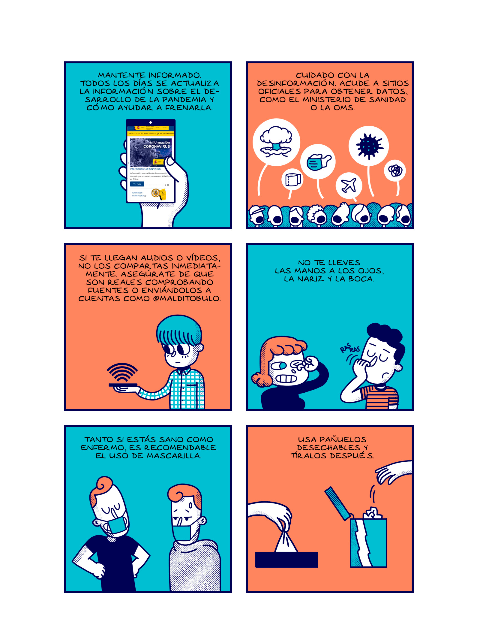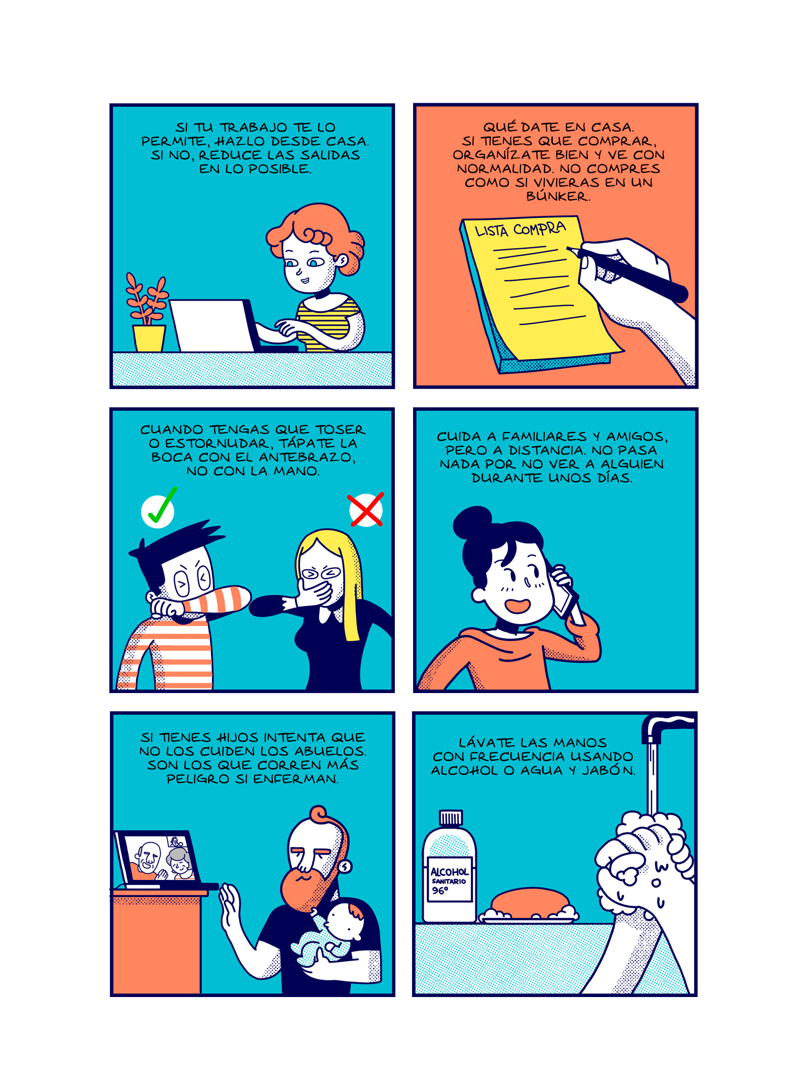 El mismo día que España decretó el estado de alarma empecé a recopilar los datos oficiales facilitados por la OMS y el Ministerio de Sanidad para ofrecer de forma sencilla y práctica los consejos más importantes para luchar contra el contagio. El resultado fue un webcómic que subí 100% gratuito a redes en colaboración directa con el Ministerio de Sanidad de España.
