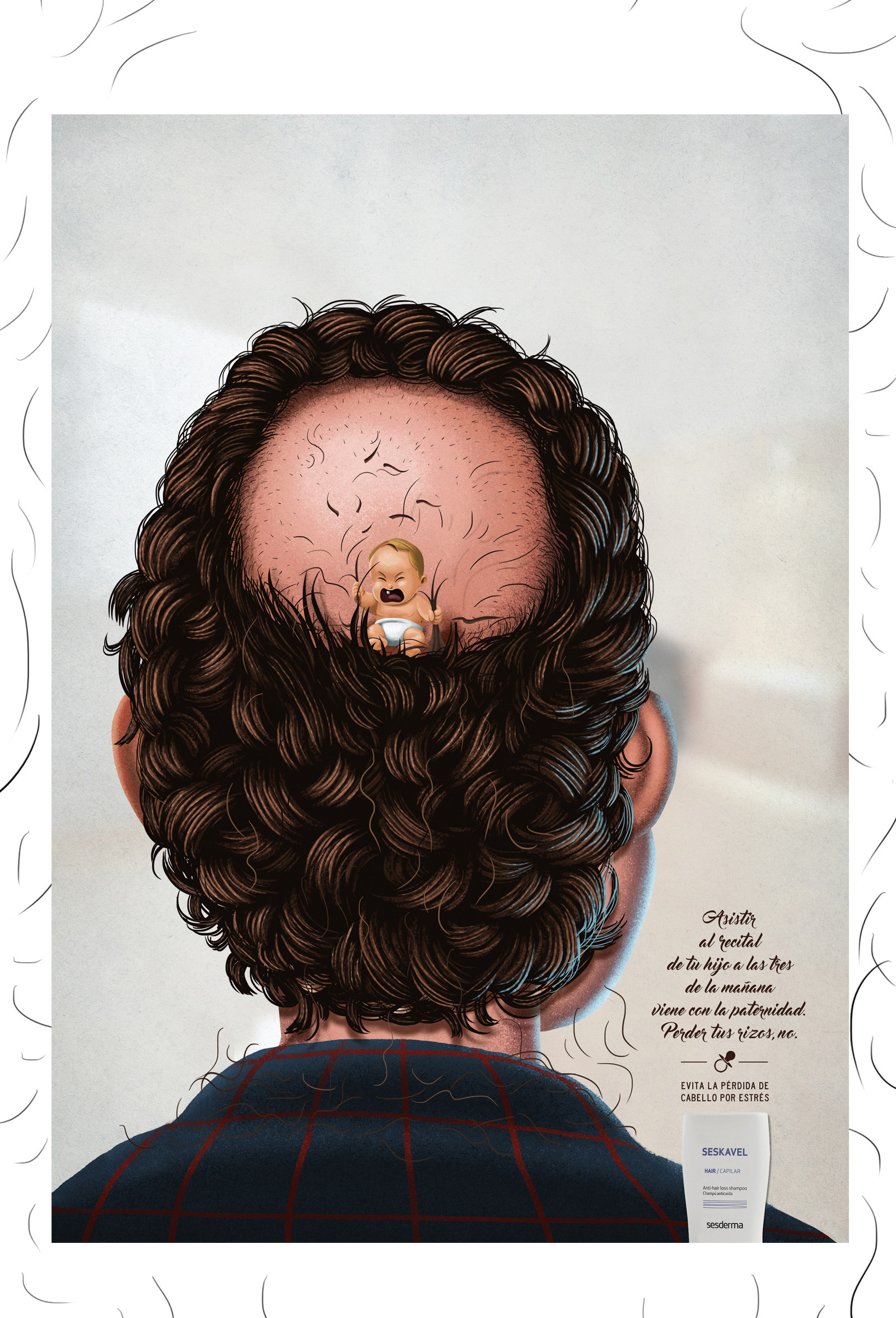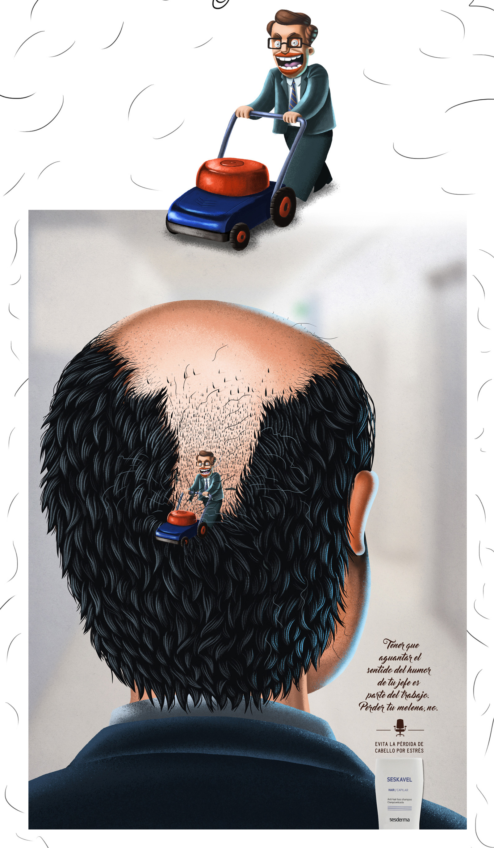 This campaign aimed to show that stress is one of the main causes of hair loss. Saskavel wanted to transmit that with illustration and humor, as an announcement of their anti-hair loss treatment.
